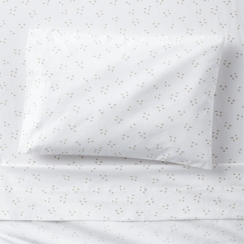 Our Twinkle Washed Organic Cotton Toddler Sheet Set delivers a casual, relaxed look that's soft on the skin—just like a favorite piece of clothing. The muted green-on-ivory color combination is crisp and cheerful, and the starry hand-illustrated print adds an abundance of charm.