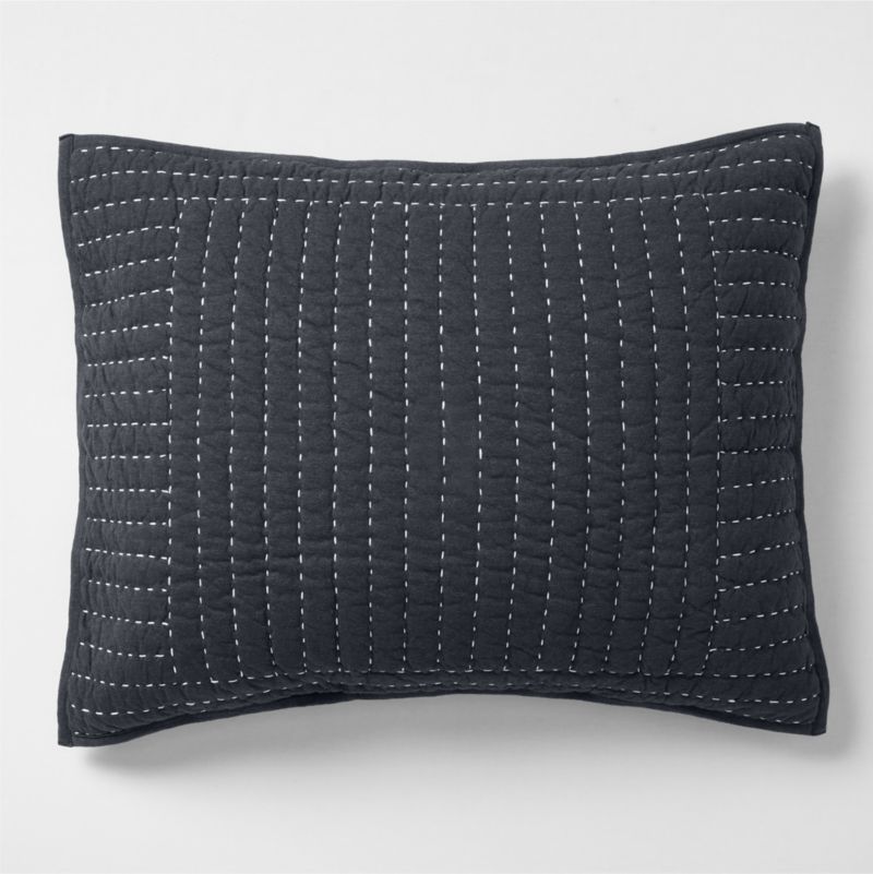 Softer than your favorite t-shirt—and just as casual-classic—our Cozysoft collection makes a bed you won't want to get out of. Traditional kantha quilting gets a modern casual update in this textural pillow sham. Stitched by hand with contrasting white thread, the deep blue organic cotton jersey is sewn into narrow channels with a running stitch for a dotted look and a supersoft ribbed feel. The perpendicularly sewn border finishes the sham with subtle linear contrast. For an ultra-inviting bed, add the matching quilt and the coordinating Midnight Navy sheet set and duvet cover.