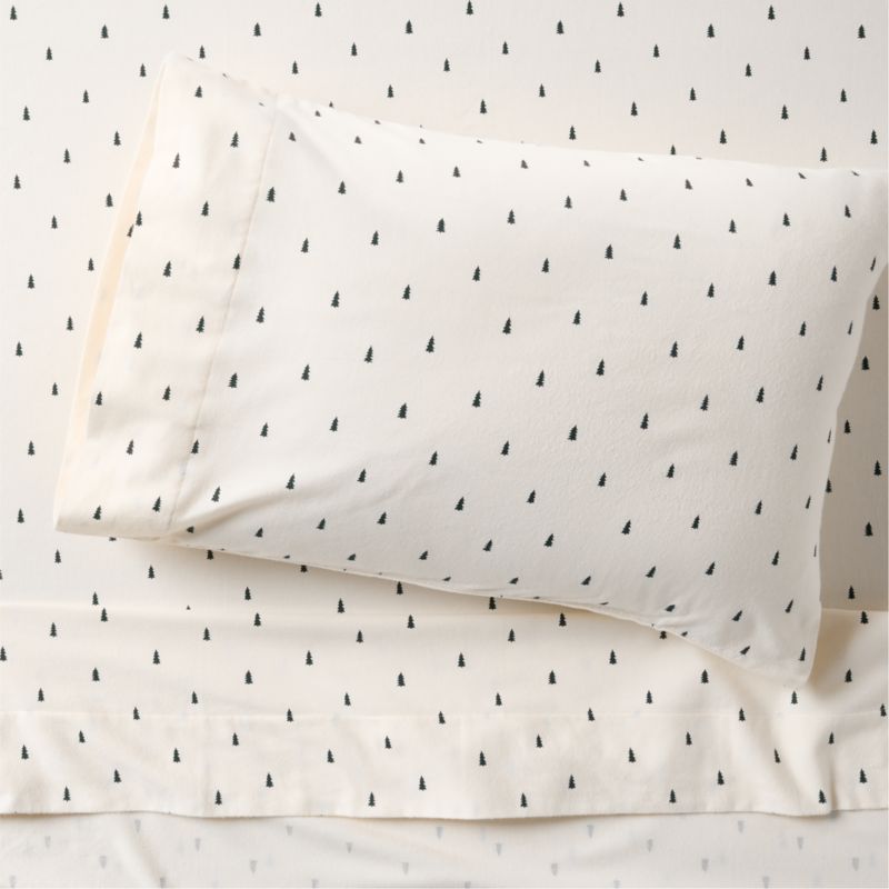 A forest's worth of our signature spruce green trees flourish on our snowy ivory flannel sheets, dressing the bed for winter with a modern, graphic pattern and whimsical style. Softer than your favorite flannel shirt—and just as casual-classic—our Cozysoft collection makes an irresistibly cozy bed. Organic cotton weaves brushed flannel bedding that's supersoft with a touch of texture. Perfect for snuggling on chilly nights, the flannel sleeps extra-warm. This charming sheet set layers with our solid-hued Cozysoft duvet covers, pillowcases and shams for a cold-weather or Christmas season look that's understated and inviting.