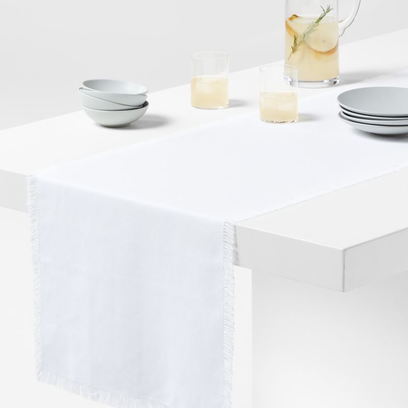 Finished on all four sides with generous fringe, our Craft runner in crisp white sets the table with a relaxed yet sophisticated softness. The organic cotton table runner offers laid-back style at weeknight meals and elegant dinners then cleans up easily in the washing machine and dryer. For a coordinated table, pair the runner with our white Craft fringe napkins.