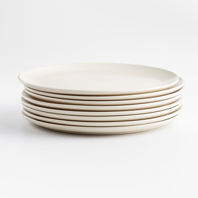 A study in delicious contradictions, our Craft flat dinner plates are strong and durable yet light and refined—and their warm minimalism suits everyday use as well as elegant occasions. A creamy linen-hued glaze coats the plates' clean, low-profile shapes, subtly accented with darker rims. The eight off-white dinner plates set a modern table accompanied by the other pieces in our exclusive Craft dinnerware, serveware and table linens collection.