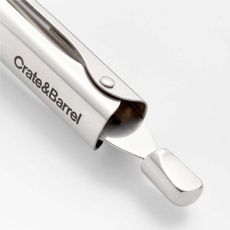 Turn grilled chicken thighs, toss salad and flip fried tofu with our signature tongs. Stainless steel shapes a sleek tool with a sturdy, scalloped grip for cooking or serving hot or cold foods. The locking mechanism ensures the large tongs store compactly in a drawer. Our exclusive Crate & Barrel kitchen collection makes for a well-outfitted workspace that's up to any cooking challenge.