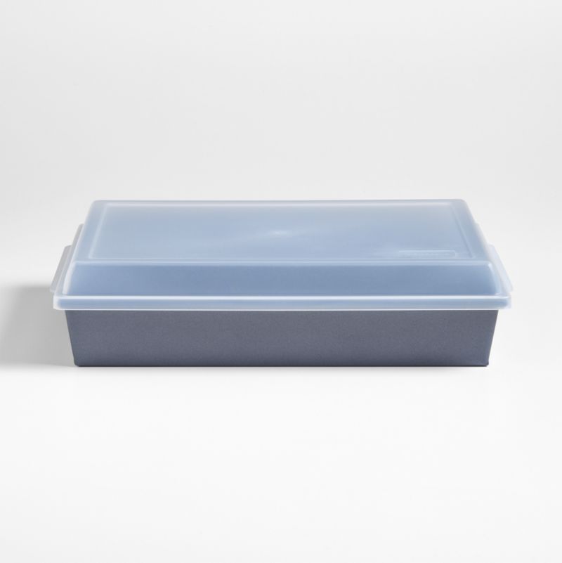 Super durable, lighter than cast iron and oh, that gorgeous unexpected slate blue. Ideal for sheet cakes, cornbread and pull-apart rolls, our slate blue cake pan is part of our exclusive bakeware collection that takes its cue from professional kitchens. Made of carbon steel—an alloy of 99% iron and 1% carbon that's nearly indestructible—the rectangular cake pan heats quickly and maintains consistent temperatures for perfectly baked foods. A double layer of silicone-based non-stick coating ensures easy release and quick cleanup. The sturdy lid lets you take your creations on the go or keep them fresh at home. Designed with enough height to accommodate up to two inches of frosting, the lid ensures safe transport of precious baked goods and cleans up easily in the dishwasher.