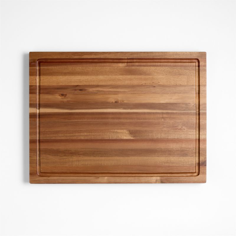 The intentionally simple designs of our signature Crate & Barrel cutting boards keep all the attention on the beauty of wood. Crafted of gorgeously grained acacia, this board showcases the wood's rich tones. The groove collects juices and crumbs as you prep, or use the board to serve cheese, charcuterie or appetizers. Modern yet timeless, our acacia board offers versatility, classic good looks and a natural durability that stands up easily to everyday cutting and chopping.