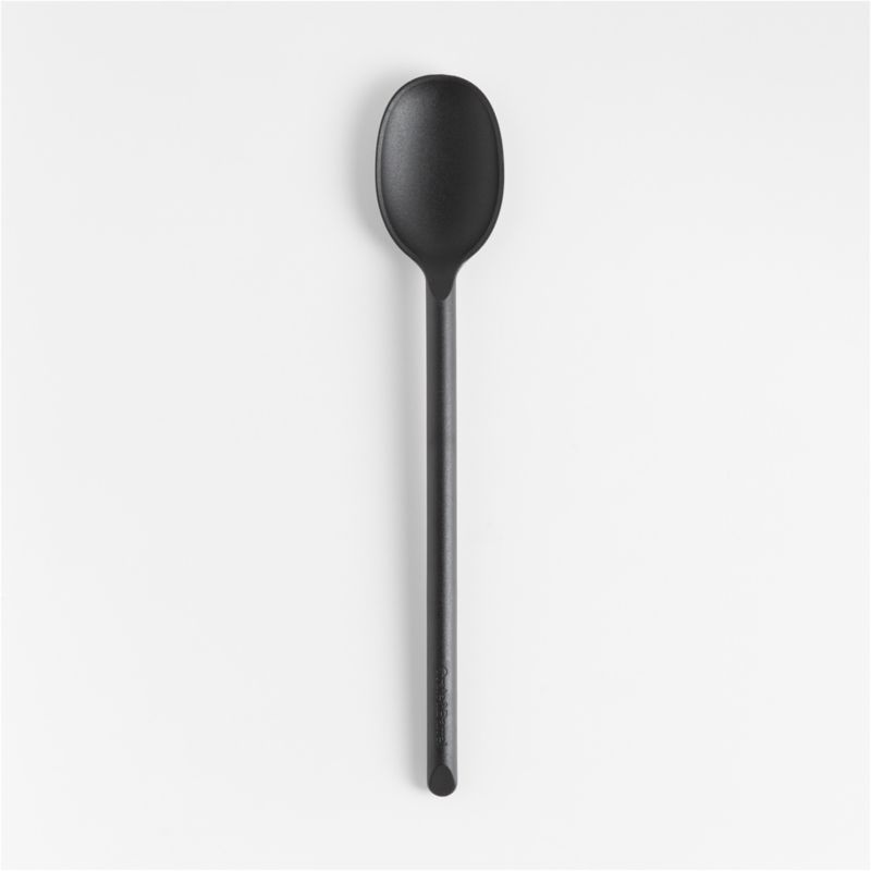 Stir, scoop and serve with our signature black nylon spoon. The essential utensil ably stirs the thickest sauces, doughs and batters as well as folds the most delicate meringues. Its flexible, tapered edges scrape the bowl, blender or pan perfectly clean, and the nylon won't damage non-stick cookware and resists stains, scratches and heat up to 350 degrees. We love the way the refined beveled edge finishes the elongated handle with a dynamic detail. Combine the dishwasher-safe kitchen spoon with the other exquisitely proportioned utensils in our exclusive Crate & Barrel collection for a well-outfitted workspace that's up to any cooking challenge.