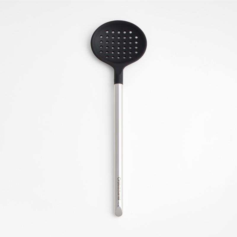 Stir, scoop and serve dumplings, pasta and peas with our signature black silicone and stainless steel slotted spoon. Constructed with a nylon core for strength, the slotted spoon has perforations that allow liquids to drain away. Soft-touch silicone won't damage non-stick pans and resists stains, scratches and heat up to 600 degrees. Polished stainless steel shapes a sleek cylindrical handle for a sturdy grip and a professional look. We love the way the refined beveled edge finishes the elongated handle with a dynamic detail. Combine the dishwasher-safe slotted spoon with the other exquisitely proportioned utensils in our exclusive Crate & Barrel collection for a well-outfitted workspace that's up to any cooking challenge.