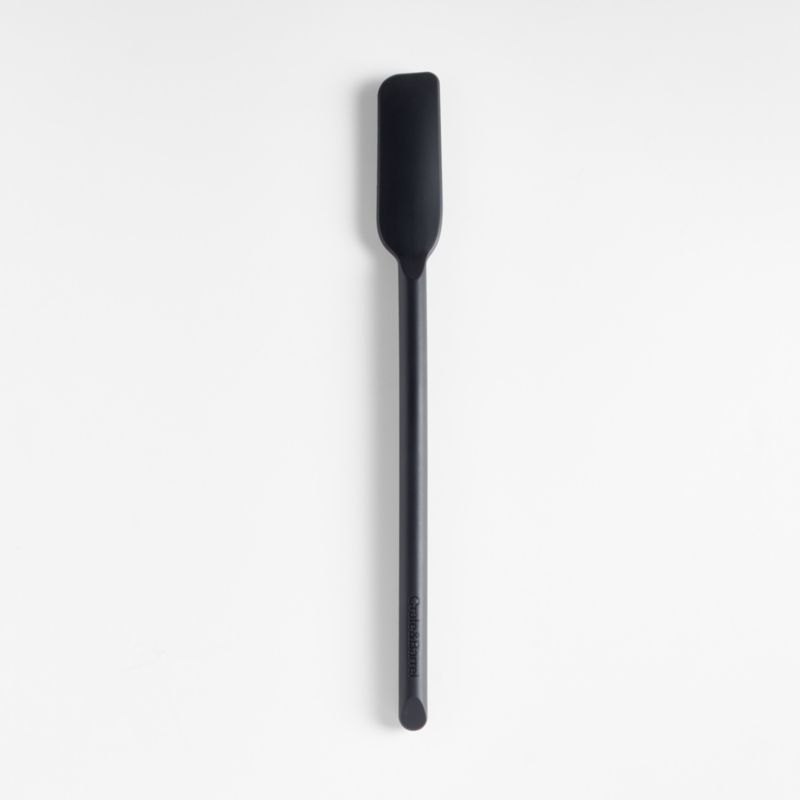Savor every last bit of honey, jam or tahini with our signature black silicone jar scraper. Constructed with a nylon core for strength, the long silicone head ably handles the thickest peanut butter as its flexible, tapered edges scrape the jar—or bowl or blender—perfectly clean. And soft-touch silicone won't damage non-stick pans and resists stains, scratches and heat. We love the way the refined beveled edge finishes the elongated handle with a dynamic detail. Combine the dishwasher-safe jar scraper with the other exquisitely proportioned utensils in our exclusive Crate & Barrel collection for a well-outfitted workspace that's up to any cooking challenge.
