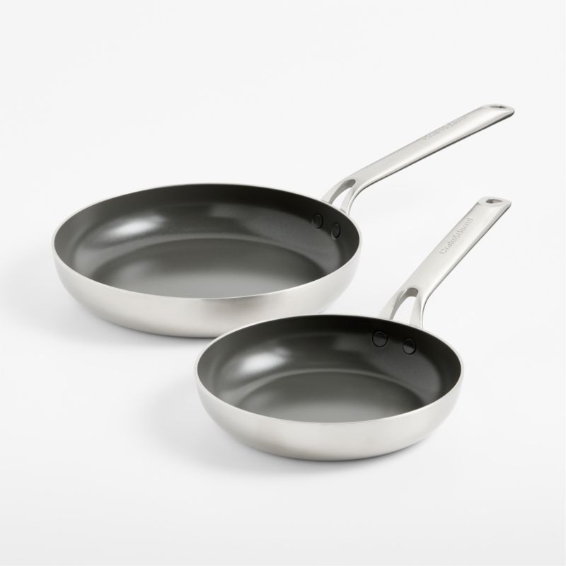 Our new EvenCook Stainless cookware collection elevates high-performance strength with a sleek finish. Premium uncoated stainless steel wraps this pair of three-ply frying pans, sandwiching aluminum cores that offer efficient heat conduction and precise temperature control. The charcoal gray ceramic non-stick cooking surfaces provide effortless food release and easy cleaning, while the matte-finished exteriors have a modern look. Ergonomic stay-cool handles complete the thoughtful construction. Handsome and timeless, our versatile 8- and 10-inch fry pans go effortlessly from stove to oven to dishwasher.