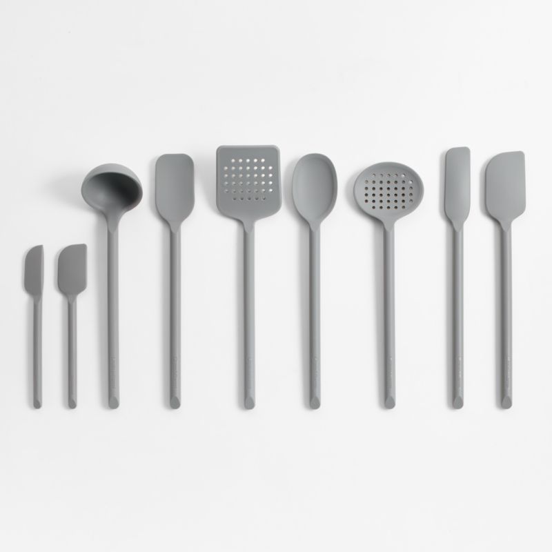 Stir, scoop, serve, scrape, flip and mix with our signature grey silicone utensils. Constructed with nylon cores for strength, the silicone heads ably spread the thickest batters, flip the most decadent burgers or fold the most delicate meringues. Their flexible, tapered edges scrape bowls, blenders and pans, while soft-touch silicone won't damage non-stick cookware and resists stains, scratches and heat up to 600 degrees. We love the way the refined beveled edges finish the elongated handles with a dynamic detail. Build your own collection of our exclusive Crate & Barrel grey utensils for a well-outfitted workspace that's up to any cooking challenge. Set includes: slotted spoon and turner, spoon, spatula, spoonula, jar scraper, ladle, mini spatula and mini jar scraper.