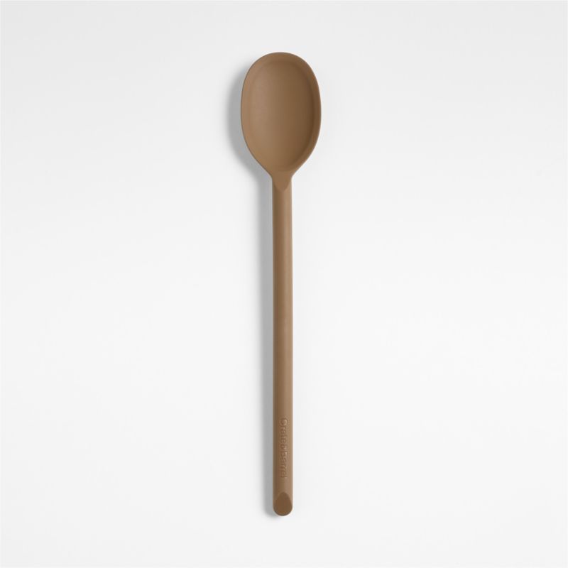 Stir, scoop and serve with our signature silicone spoon in warm, mushroom-inspired brown. Constructed with a nylon core for strength, the utensil ably stirs the thickest sauces, doughs and batters—or folds the most delicate meringues. Its flexible, tapered edges scrape the bowl, blender or pan clean. The soft-touch silicone won't damage non-stick cookware, resists scratches and tolerates heat up to 500°F. We love the way the refined beveled edge finishes the elongated handle with a dynamic detail. Combine the dishwasher-safe spoon with the other exquisitely proportioned utensils in our exclusive Crate & Barrel collection for a well-outfitted workspace that's up to any cooking challenge.