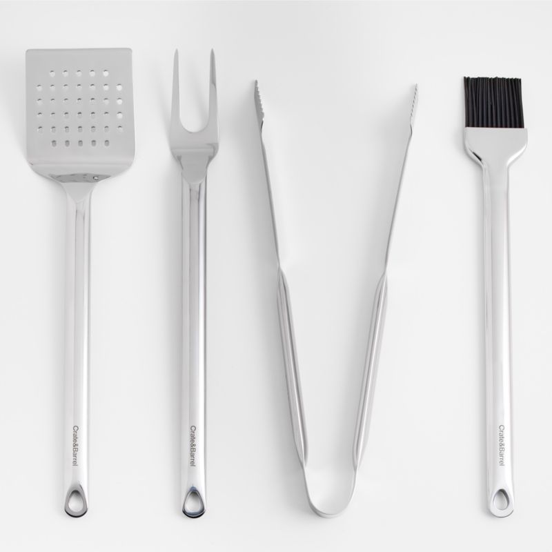 Flip burgers, baste ribs, serve brats and reposition wings with our signature grill tools. Polished stainless steel shapes a sleek turner, fork, basting brush and tongs with cylindrical handles for a sturdy grip and a professional look. We love the way the refined beveled edges finish the elongated handles with dynamic detail to coordinate with our Kitchen by Crate cooking utensils.