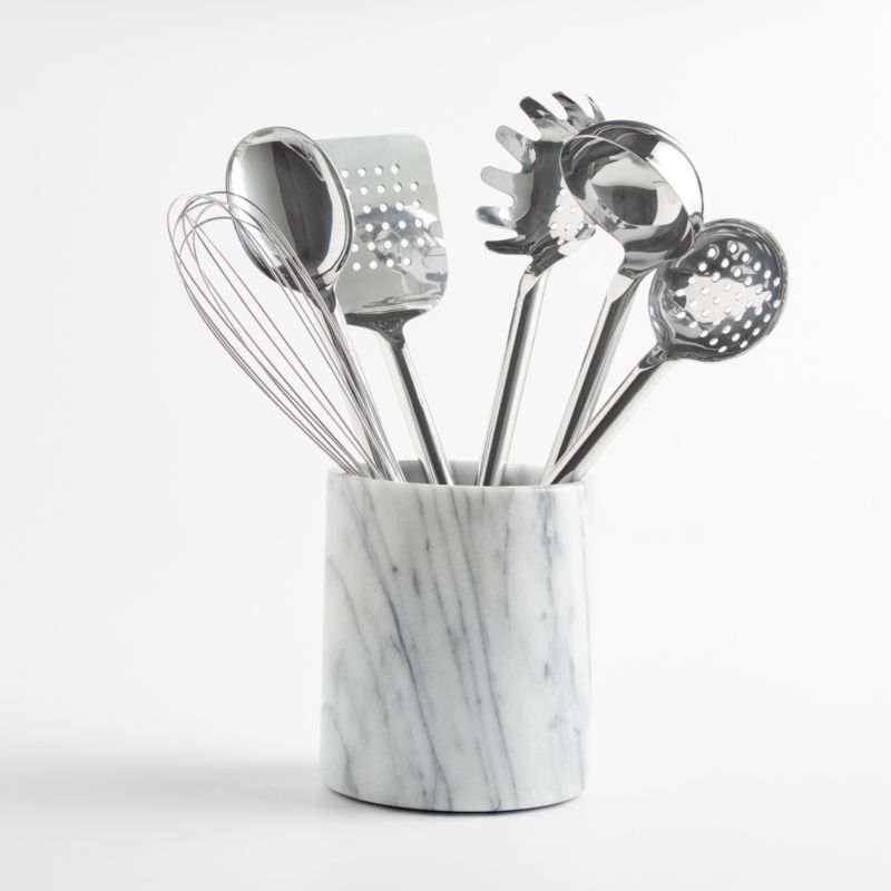 Stir, scoop, serve, scrape, flip and mix with our signature stainless steel utensils, all corralled in a marble utensil holder. Polished stainless steel shapes sleek utensils with cylindrical handles for a sturdy grip and a professional look. We love the way the refined beveled edges finish the elongated handles with a dynamic detail. This set includes a dishwasher-safe, exquisitely proportioned spoon, slotted spoon, pasta spoon, ladle, slotted turner and 12" whisk. Inspired by French kitchens, the grand cylinder of cool white marble with unique grey veining keeps the stainless steel utensils on hand for a modern mixed-materials look.