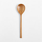 Stir, scoop and serve with our signature teak spoon. The essential utensil can mix thick doughs as well as fold delicate meringues. Showing off its lovely grain, sustainably sourced teak shapes the modern organic tool with a stunning look and a unique handle. The tapered handle shapes a figure eight, adding a sculptural element we love. Combine the spoon with the other exquisitely proportioned utensils in our exclusive Crate & Barrel collection for a well-outfitted workspace that's up to any cooking challenge.