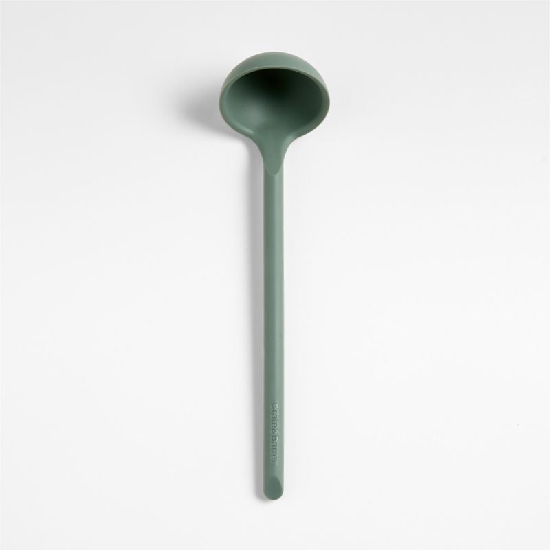 Scoop and serve soups, stews and sauces with our signature silicone ladle. Constructed with a nylon core for strength, the silicone head ably handles the thickest chili, bisque or bolognese. Soft-touch silicone in a fresh grey-green hue inspired by thyme won't damage non-stick pans and resists scratches and heat up to 500°F. We love the way the refined beveled edge finishes the elongated handle with a dynamic detail. Combine the dishwasher-safe ladle with the other exquisitely proportioned utensils in our exclusive Crate & Barrel collection for a well-outfitted workspace that's up to any cooking challenge.