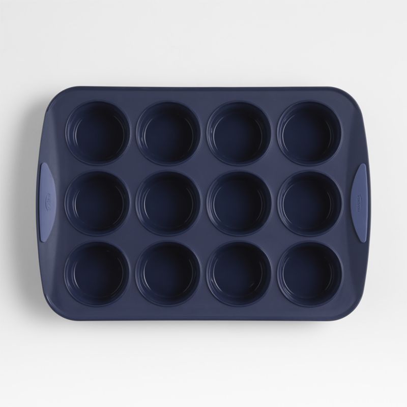 Corn muffins, lemon cupcakes and mini frittatas pop right out of this silicone muffin pan. Crafted of flexible silicone, the pan bakes evenly and releases baked goods perfectly. The integrated steel rim keeps the pan stable as you move it into and out of the oven. Fitted with sturdy handles, this deep blue pan bakes a dozen treats and cleans up easily in the dishwasher.