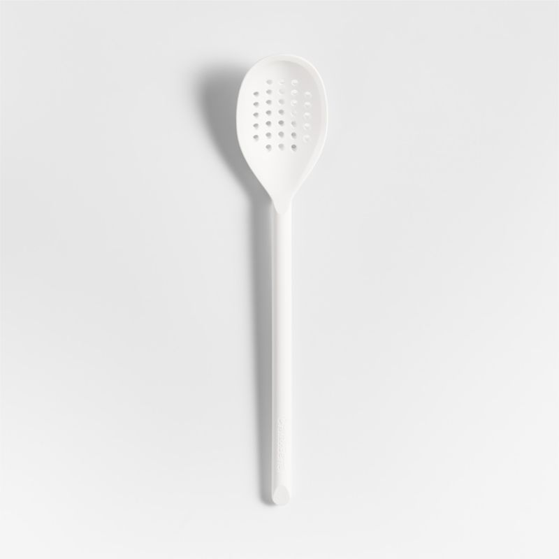 Stir, scoop and serve dumplings, pasta and peas with our signature white silicone deep slotted spoon. Constructed with a nylon core for strength, the double-capacity spoon is generously sized to scoop and serv with perforations that allow liquids to drain away. Soft-touch silicone won't damage non-stick pans and resists stains, scratches and heat up to 600 degrees, and a refined beveled edge finishes the handle with dynamic detail. Combine the dishwasher-safe deep slotted spoon with the other exquisitely proportioned utensils in our exclusive Crate & Barrel collection for a well-outfitted workspace that's up to any cooking challenge.