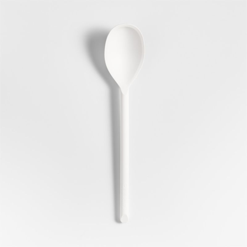 Stir, scoop and serve with our signature white silicone deep spoon. Constructed with a nylon core for strength, the double-capacity spoon is generously sized to scoop and serve. Its flexible, tapered edges scrape the bowl, blender or pan perfectly clean, and soft-touch silicone won't damage non-stick cookware and resists stains, scratches and heat up to 600 degrees. We love the way the refined beveled edge finishes the elongated handle with a dynamic detail. Combine the dishwasher-safe deep spoon with the other exquisitely proportioned utensils in our exclusive Crate & Barrel collection for a well-outfitted workspace that's up to any cooking challenge.