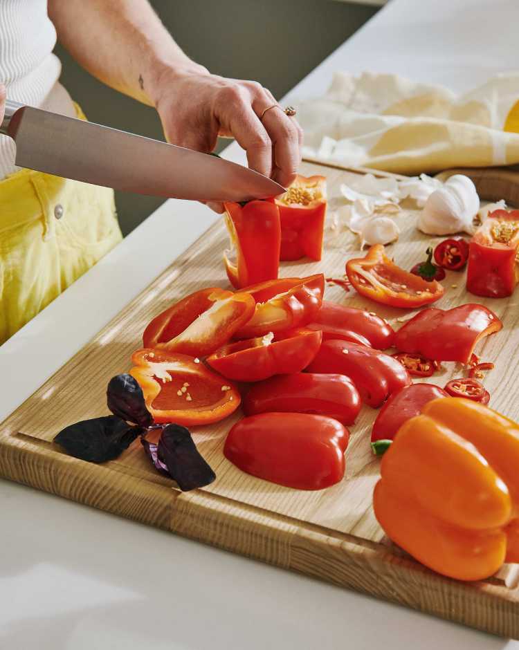 “I have a complicated relationship with bell peppers. When they’re raw, I hate them. But give them enough time, some heat and even more olive oil and they will eventually become jammy, sweet and intoxicatingly delicious. These long-cooked peppers are delicious when paired with herbs and a salty cheese, like feta, and eaten as you would a caprese salad. But you could also spread them on sandwiches (they will take your hoagie game to the next level), toss them into salads, serve them on an antipasto platter or spoon them over a piece of chicken or fish with enormous results. They last for quite a while, since they’re essentially packed in olive oil, so make a batch or two and keep them on hand for their many uses. Just please don’t use green bell peppers in this roasted peppers recipe—even an hour of luxuriating in olive oil can’t save those godforsaken creatures.”