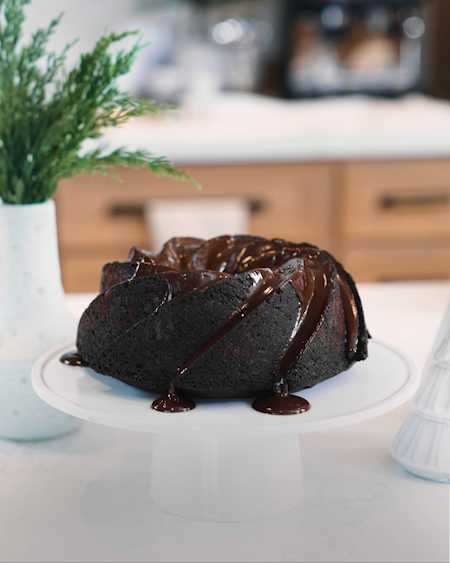 - Once the Bundt cake is cool, make the chocolate ganache. Combine all ganache ingredients in a microwave-safe bowl and microwave on medium in 30-second intervals, stirring between each interval until ganache is smooth and glossy.