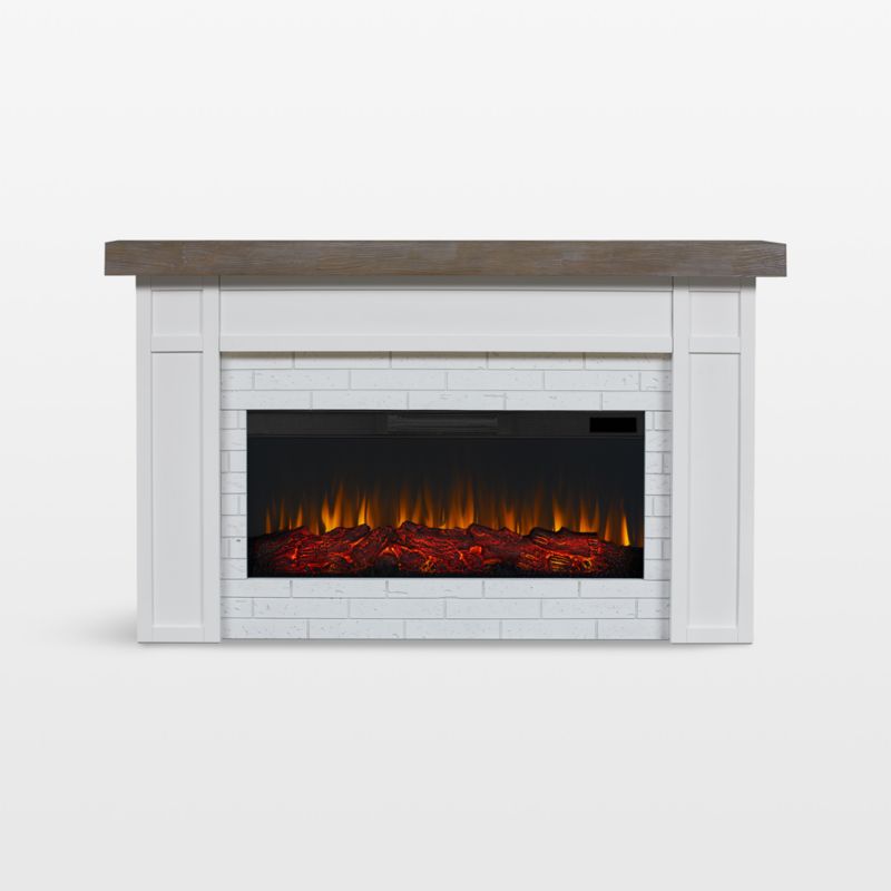 Add the coziness and charm of a wood-burning hearth to your home with our electric fireplace. Designed in the style of a traditional fireplace—complete with a faux brick surround and a wood mantel—Cravenhall creates dynamic glowing embers and warm dancing flames in six colorways. Use the remote control to set your desired brightness, temperature and time, or choose the heatless flame option when you want the look but not the feel of fire. A Crate & Barrel exclusive, the white electric fireplace instantly adds welcoming ambiance to any room.