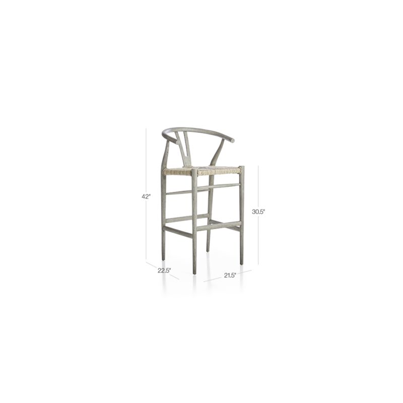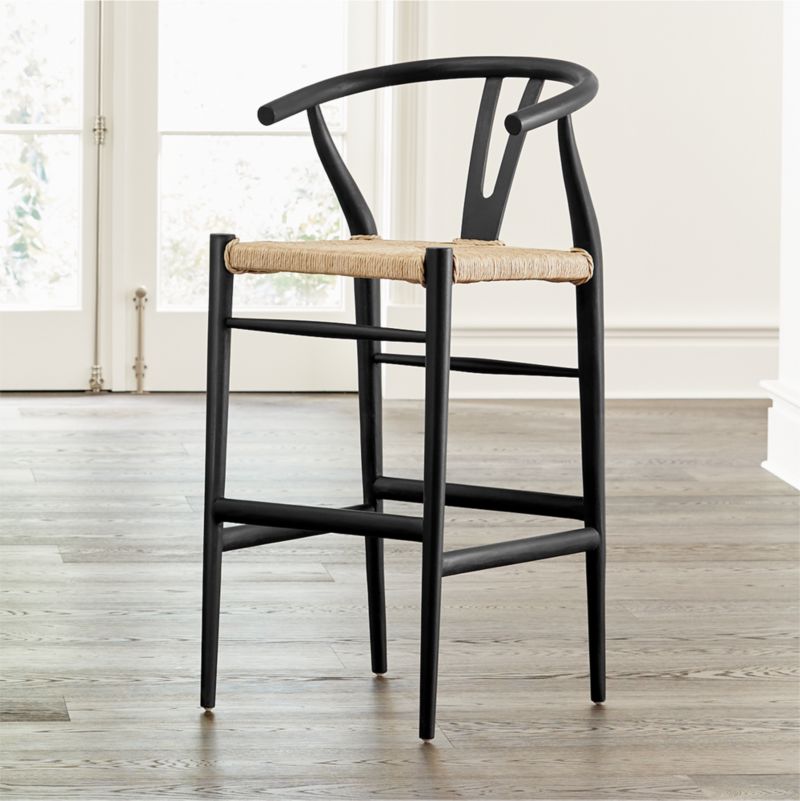Inspired by traditional Chinese design, this classic stands tall as a modern bar stool. Fashioned with its signature Y-back and semi-circular arms, the stool contrasts a woven synthetic wicker seat with a frame of black-finished teak. The handcrafted stool is skillfully constructed with mortise-and-tenon joinery and corner block seating.