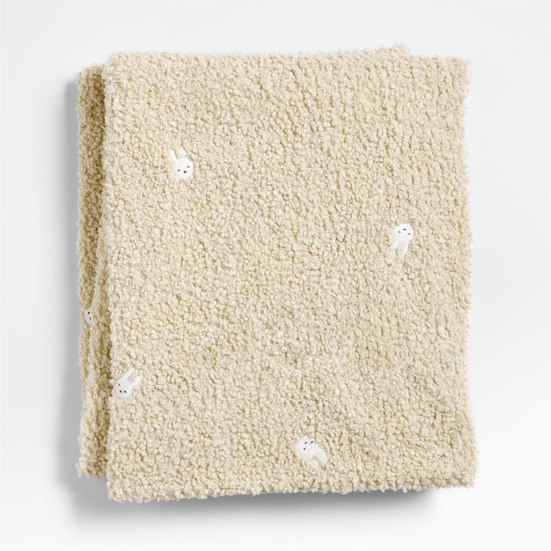 Made for snuggles, the fleecy texture of our cuddly Sherpa Bunny Face throw blanket is so soft you'll wish it came in adult sizes too. In a gorgeous neutral oatmeal hue, the blanket features a sweet tossed pattern of embroidered bunny faces and reverses to a luxe recycled polyester velvet.