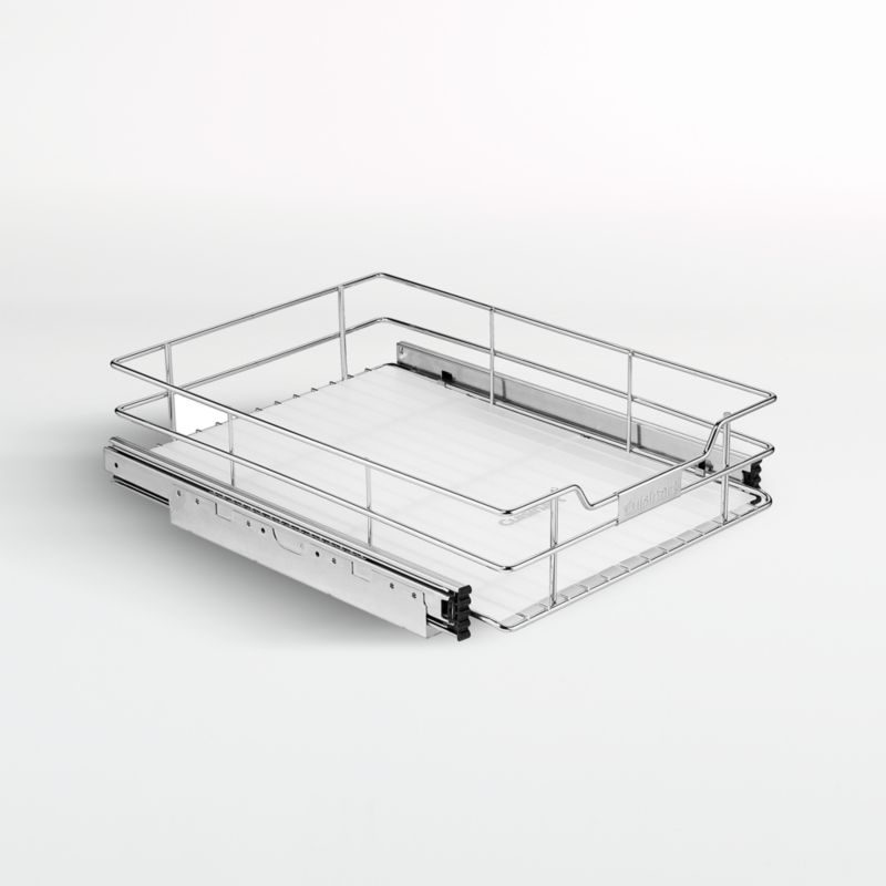 Manage your cabinet's contents with this easily accessible organizer. Constructed of chrome-plated steel, the wire basket slides out smoothly thanks to heavy-duty ball bearing tracking. The sliding cabinet organizer installs easily and holds up to 70 pounds of small appliances, cookware or dry goods, while the removable plastic mat keeps everything tidy.