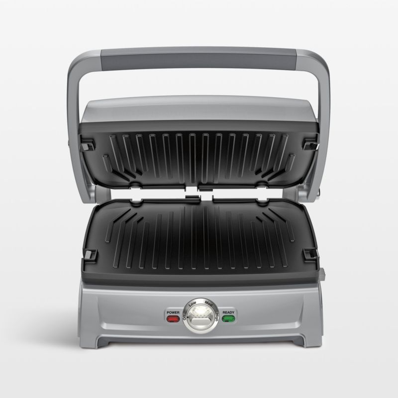 Cuisinart's powerful and versatile Griddler offers five cooking options for every meal of the day: contact grill, panini press, full griddle, full grill and half griddle/half grill. The reversible and removable nonstick grill-griddle plates provide a large surface area for cooking plenty of pancakes, eggs and bacon or grilling hamburgers and veggie kabobs. For perfectly melty paninis, the hinge adjusts to the thickness of your sandwiches for optimal pressing. The integrated drip tray collects grease, and all removable parts clean up easily in the dishwasher.