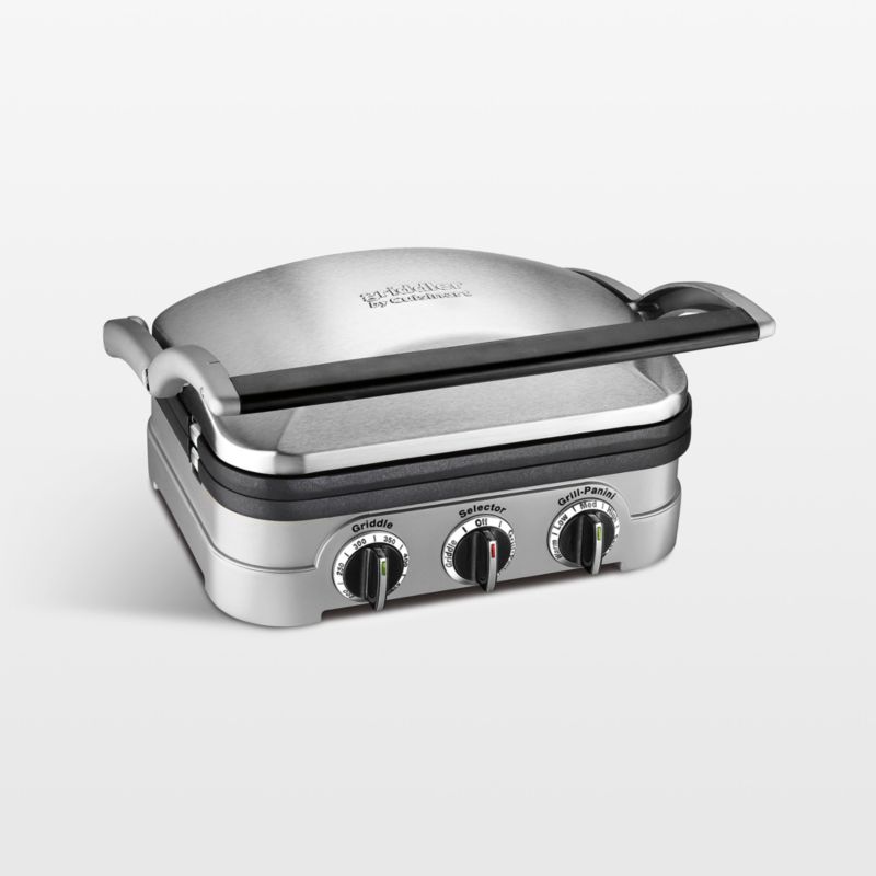 Cuisinart's powerful and versatile Griddler offers five cooking options for every meal of the day: contact grill, panini press, full griddle, full grill and half griddle/half grill. The reversible and removable nonstick grill-griddle plates provide a large surface area for cooking plenty of pancakes, eggs and bacon or grilling hamburgers and veggie kabobs. For perfectly melty paninis, the hinge adjusts to the thickness of your sandwiches for optimal pressing. The integrated drip tray collects grease, and all removable parts clean up easily in the dishwasher.