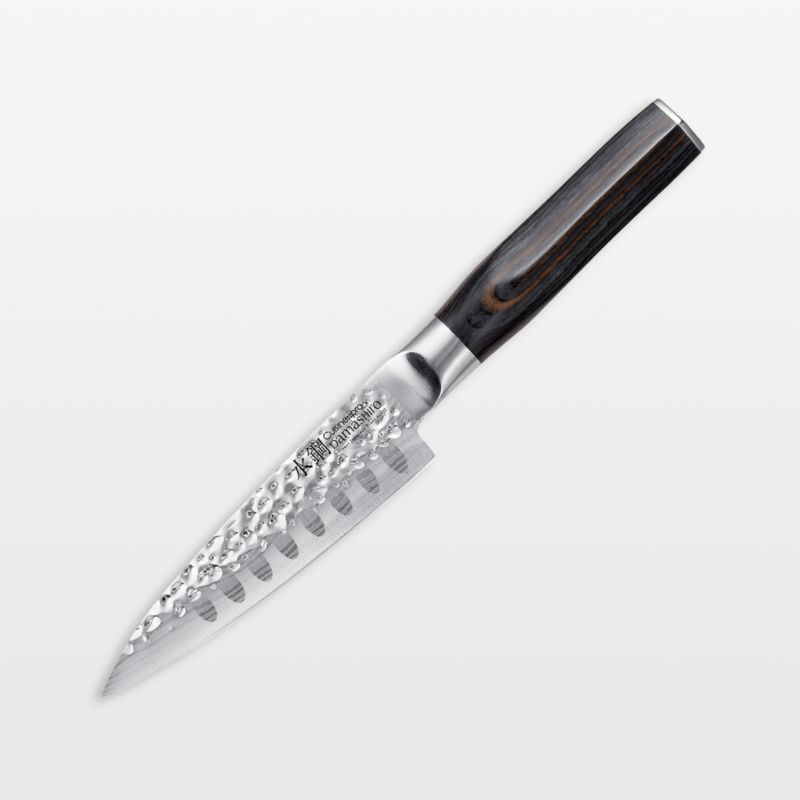 Inspired by traditional Japanese craftsmen and samurai sword makers, Cuisine::pro Damashiro Emperor knives feature stunning Damascus-style patterned blades suggestive of flowing water. The knives are made of ice-hardened Japanese steel, making them tough, shatter-resistant and able to hold a razor-sharp, resilient edge. Equipped with a handsome, ergonomically designed wood handle finished in dark walnut, the medium-sized utility knife is ideal for all cutting, chopping and slicing tasks.