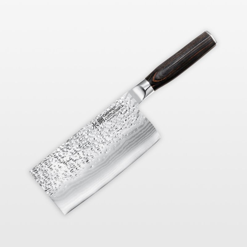 Inspired by traditional Japanese craftsmen and samurai sword makers, Cuisine::pro Damashiro Emperor knives feature stunning Damascus-style patterned blades suggestive of flowing water. The knives are made of ice-hardened Japanese steel, making them tough, shatter-resistant and able to hold a razor-sharp, resilient edge. Equipped with a handsome, ergonomically designed wood handle finished in dark walnut, the cleaver effortlessly portions poultry and larger cuts of meat. Its weighted design makes it easy to chop through bone and joints.