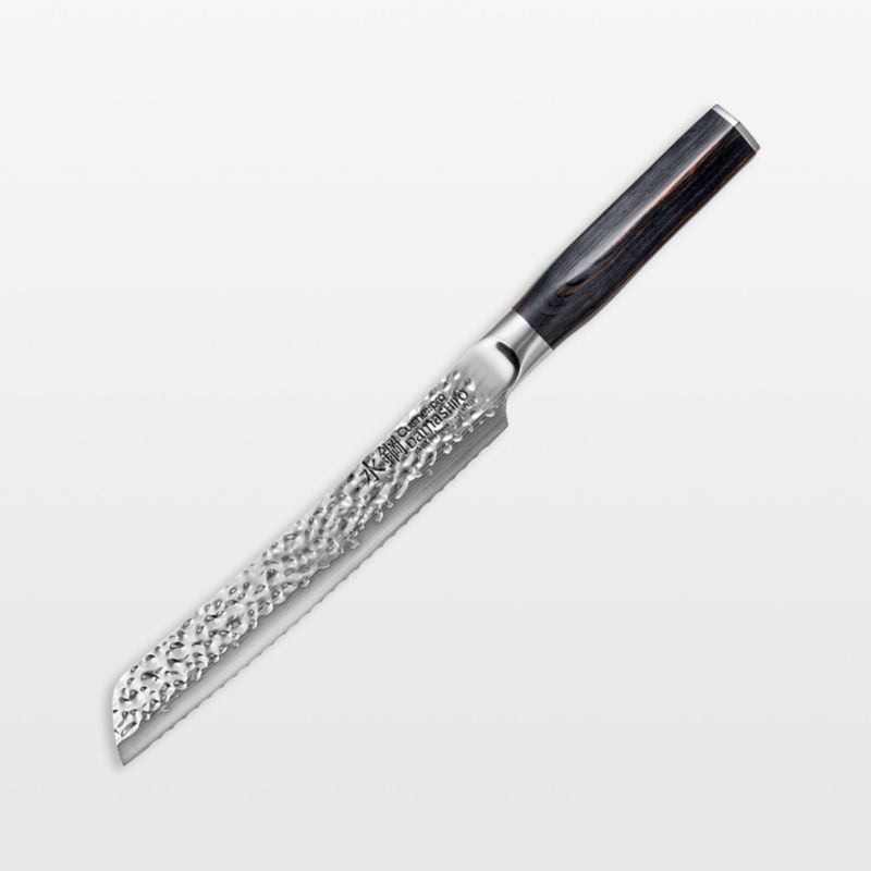 Inspired by traditional Japanese craftsmen and samurai sword makers, Cuisine::pro Damashiro Emperor knives feature stunning Damascus-style patterned blades suggestive of flowing water. The knives are made of ice-hardened Japanese steel, making them tough, shatter-resistant and able to hold a razor-sharp, resilient edge. Equipped with a handsome, ergonomically designed wood handle finished in dark walnut, the serrated bread knife saws through crusty loaves or tomatoes without tearing or crushing.