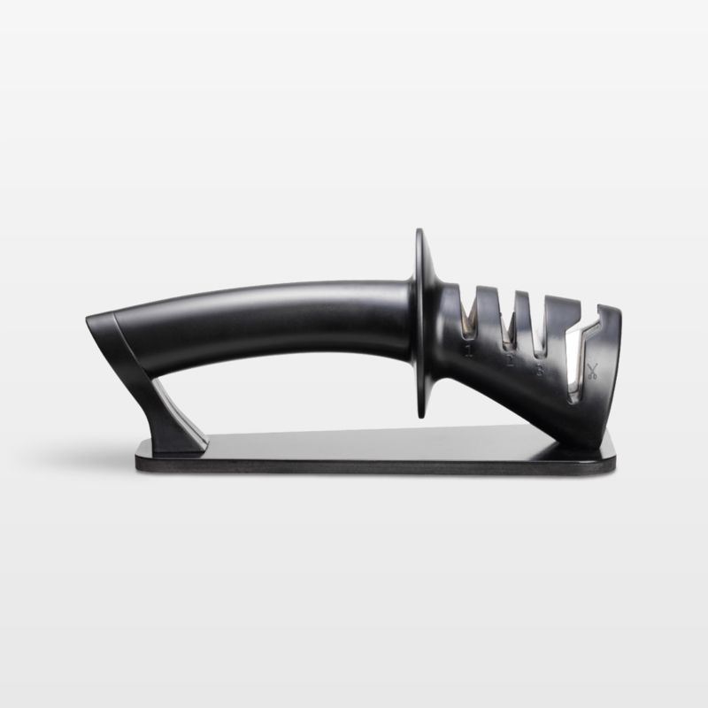 Keep your Cuisine::pro iD3 Black Samurai knife in optimal condition with this specially designed knife sharpener. Using a combination of coarse diamond, tungsten steel and ceramic wheels, the sharpener shapes, sharpens and polishes knife blades in three easy steps. Simply place the sharpener on a flat surface and pull blades through the designated slot for each step. Ergonomically designed for a comfortable grip, the sharpener has rubber feet to keep the process safe and secure.