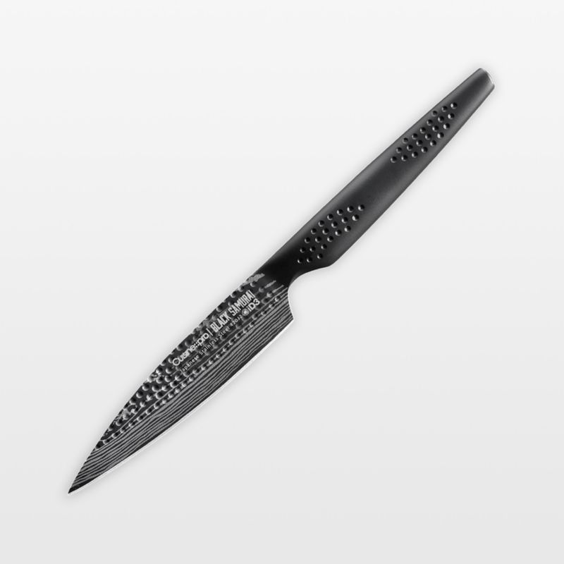 Cuisine::pro's iD3 Black Samurai knives are razor-thin and exceptionally sharp for fast and agile cutting, slicing and dicing. Made of premium Japanese steel, the knives are manufactured with techniques inspired by traditional Japanese craftsmanship and samurai sword making. The blades are tough, shatter-resistant and honed to a fine, razor-sharp edge with Damascus-style patterning suggestive of flowing water. A ceramic black coating makes the knives stain-resistant, nonreactive and antibacterial. The medium-sized utility knife is ideal for all cutting, chopping and slicing tasks. Plus, the asymmetrical handle with MicroDot technology conforms to main pressure points in the hand for maximum control and comfort.