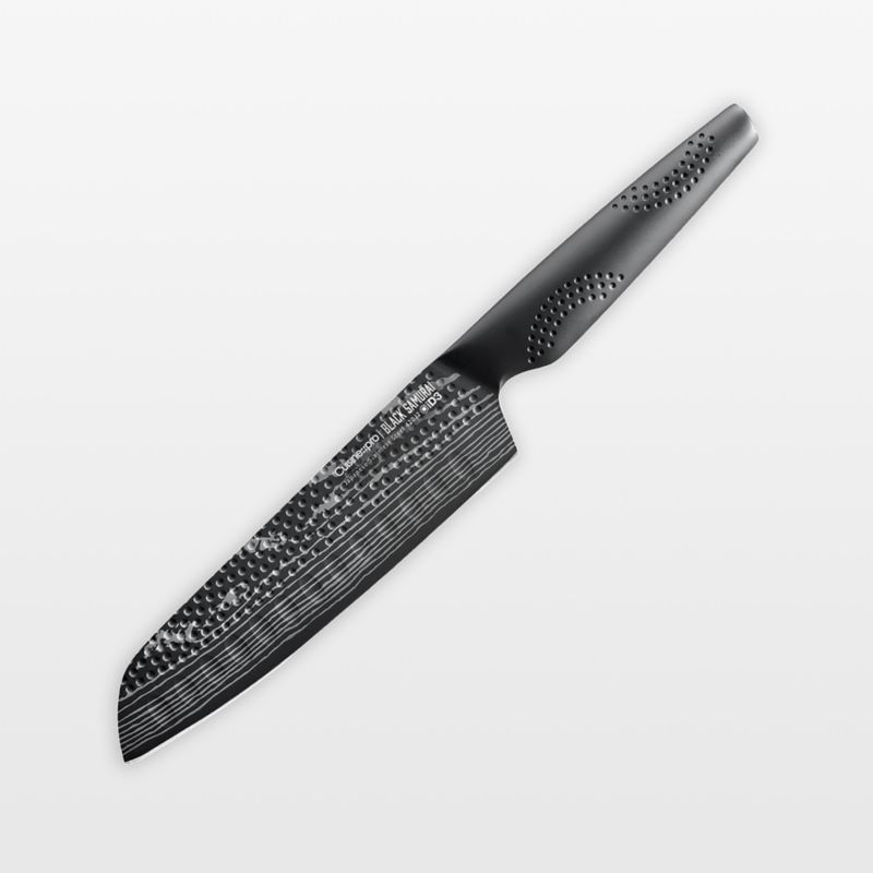 Cuisine::pro's iD3 Black Samurai knives are razor-thin and exceptionally sharp for fast and agile cutting, slicing and dicing. Made of premium Japanese steel, the knives are manufactured with techniques inspired by traditional Japanese craftsmanship and samurai sword making. The blades are tough, shatter-resistant and honed to a fine, razor-sharp edge with Damascus-style patterning suggestive of flowing water. A ceramic black coating makes the knives stain-resistant, nonreactive and antibacterial. The santoku knife has a broad blade and low tip for precise control and recessed scallops along the blade to reduce friction and release cut foods. Plus, the asymmetrical handle with MicroDot technology conforms to main pressure points in the hand for maximum control and comfort.