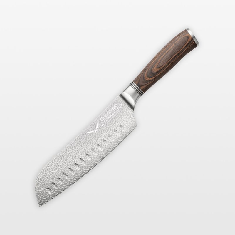 Cuisine::pro's Le Connoisseur knives deliver exceptional performance along with high design. The premium German steel blades are stamped with a striking cobblestone texture that nods to French architecture while serving the practical purpose of releasing sliced foods easily. The double-beveled and twice-sharpened knives are ultra sharp and engineered for superior performance. Equipped with a contoured, walnut-finished wood handle, the santoku knife has a broad blade and low tip for precise control. Use it to prepare meats, fruits and vegetables with speed and accuracy. Recessed scallops along the blade help to reduce friction and release cut foods.