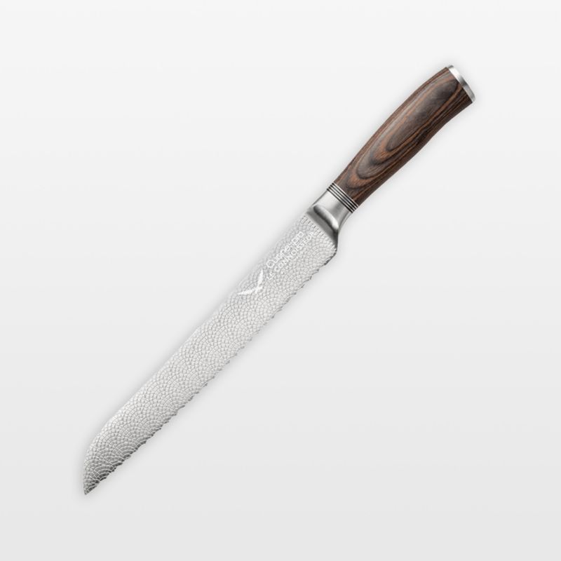Cuisine::pro's Le Connoisseur knives deliver exceptional performance along with high design. The premium German steel blades are stamped with a striking cobblestone texture that nods to French architecture while serving the practical purpose of releasing sliced foods easily. The double-beveled and twice-sharpened knives are ultra sharp and engineered for superior performance. Equipped with a contoured, walnut-finished wood handle, the serrated bread knife saws through crusty loaves or tomatoes without tearing or crushing.