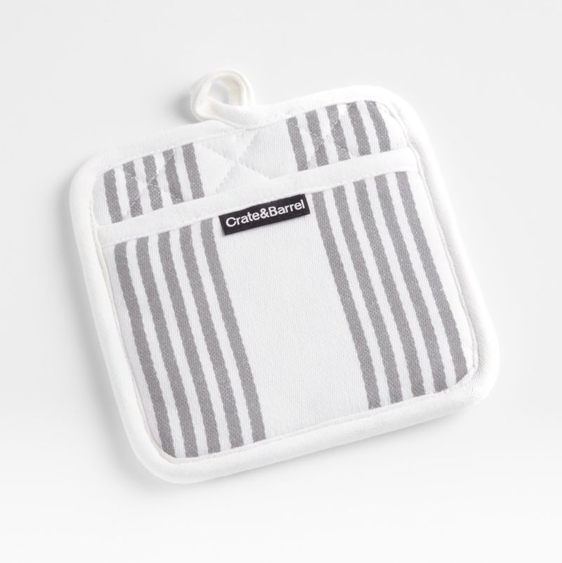 Simple kitchen essentials in quality cotton are striped thick and thin in bright white and soft grey. Our organic cotton pot holder cleans up easily in the washing machine and gets softer with use and laundering. Pair our exclusive hot pad with our other grey-and-white Cuisine Stripe textiles for a classic and coordinated kitchen.
