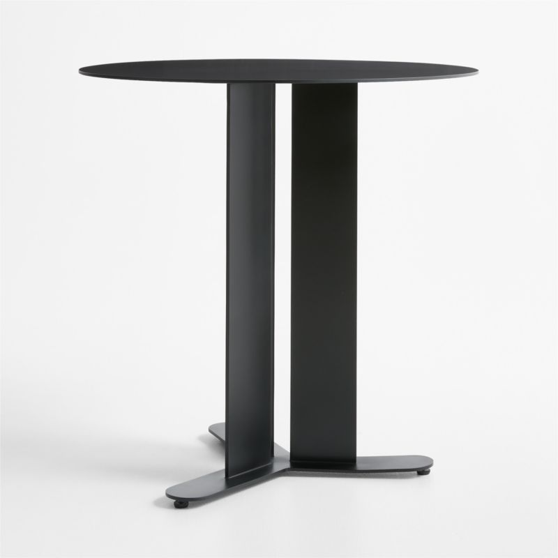 Cupertino brings its striking silhouette to intimate outdoor dining. Made of weather-resistant stainless steel with a black finish, the bistro table lends a modern look to patios or balconies with a bold, linear design. The tripod base supports fin-shaped legs that look broad when viewed at a perpendicular angle and become pencil-thin when seen on the edge.