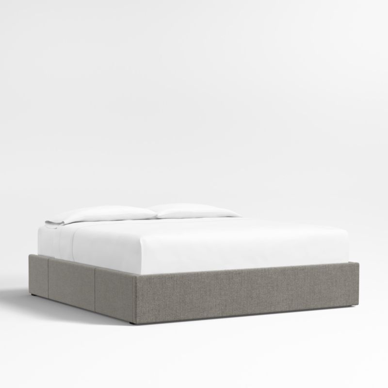 Our custom bed collection lets you mix and match our top-selling headboards and bases for a look that's truly yours. A great choice for smaller, storage-challenged bedrooms, this base includes three roomy drawers—one on each side and one at the foot of the bed—for storing off-season clothes and extra blankets. As a plus, the side drawers open with just enough clearance to avoid hitting nightstands and other bedroom furniture. Padded and neatly tailored, the storage bed is upholstered in a dark grey bouclé weave. Our exclusive grey storage bed base is designed to fit perfectly with any of our signature headboards.