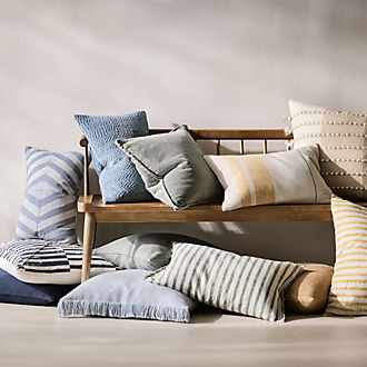 Cuddle up in your space with a throw blanket from Crate and Barrel. Throws are made from high quality materials including wool, cotton, acrylic and more. In living rooms, family rooms and dens, add a blanket to the corner of a loveseat, chair or slipcovered sofa for extra warmth and texture. Update existing furniture by draping a throw blanket across the center of sofas, and finish the look with coordinating throw pillows. Create a monochromatic aesthetic by choosing blankets, pillows and curtains in complementary neutral hues such as grey, beige, tan and brown. Indulge in the warmth of luxurious alpaca throws or soft sheepskin throws that double as rugs. In bedrooms, consider placing a woven blanket on the end of the bed, perfect for chilly nights. Find blankets in a variety of tonal colors and seasonal patterns to accent any couch, such as a low profile sofa or bench seat sofa. Christmas pillows and throws are especially fitting for capturing the feeling of your cozy Christmas theme. Pastel woven options, on the other hand, coordinate well with spring decor and Easter decorations. Add a punch of style and comfort to your home with snug-looking fringe designs, or give one as a thank you gift to a friend.