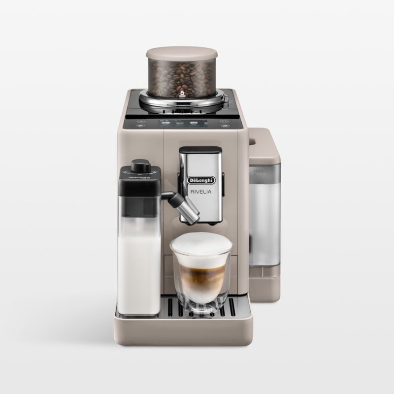 Expand your coffee horizons with the Rivelia coffee maker from Delonghi. An innovative bean switch system uses two interchangeable hoppers to let you swap one bean type for another—say dark roast for a morning espresso and late-night decaf—without the hassle of refilling. You can set and save each bean type's ideal grind, dose and extraction temperature. Use the CoffeeRoutine to save your daily coffee-drinking schedule and preferences, and make suggestions at the appropriate time of day. One-touch operation lets you grind, dose, brew and froth 16 coffee drinks, and 18 pre-set options let you enjoy a perfectly made latte, cappuccino, cortado, iced coffee and more. Winner of the prestigious iF Design Award, the sleek, compact coffee maker in sand beige takes pride of place on your countertop or coffee bar.