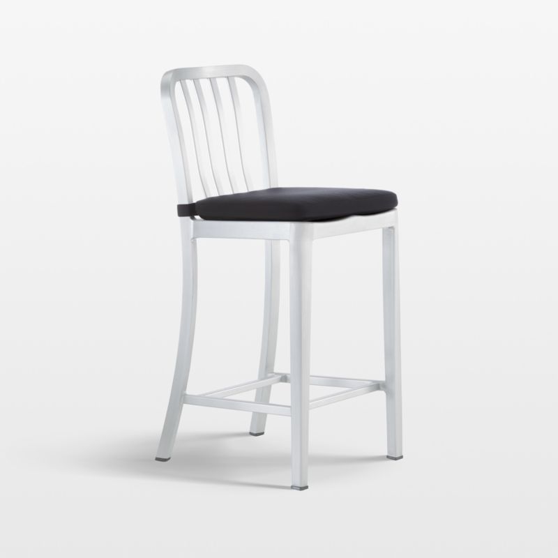 Delta features straightforward styling in pure aluminum, anodized for a sleek, durable finish. Classic and contemporary, the stool has a casual look that mixes well with metal, wood or glass furnishings. Crafted of machine-cut anodized aluminum, each sturdy yet lightweight stool is welded together and hand polished to a soft sheen. The contoured back and molded seat ensure a comfortable sit. Our plush cushion elevates the look and feel and attaches to the chair with fabric tab fasteners.
