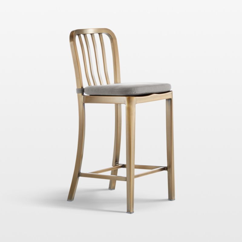 The Delta counter stool features straightforward styling in pure aluminum with a smart brushed brass finish. Classic industrial and contemporary, the stool has a casual look that mixes well with metal, wood or glass furnishings. Each sturdy lightweight counter stool is welded and hand polished. The contoured back and molded seat ensure a comfortable sit at the kitchen counter or work table. Our plush cushion elevates the look and feel and attaches to the chair with fabric tab fasteners. The Delta Brass Counter Stool is a Crate and Barrel exclusive.