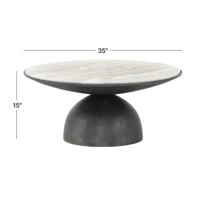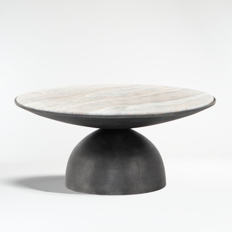 A true work of art, sculptural Dev perfectly balances two sliced spheres to create this gorgeous coffee table. Hammered for light-catching texture, the grey-finished aluminum base curves in and out to support an inset tabletop of creamy taupe marble. We love Dev's visual interplay of rustic metal and dynamically veined smooth marble.