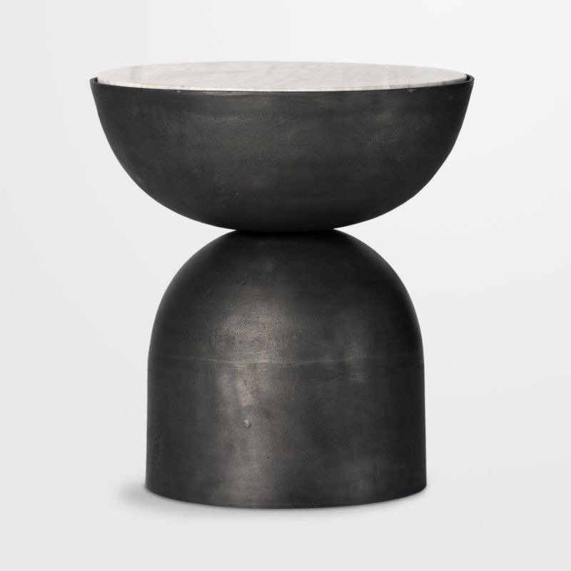 A true work of art, sculptural Dev perfectly balances two sliced spheres to create this gorgeous end table. Hammered for light-catching texture, the grey-finished aluminum base curves in and out to support an inset tabletop of creamy white marble. We love Dev's visual interplay of rustic metal and dynamically veined smooth marble.