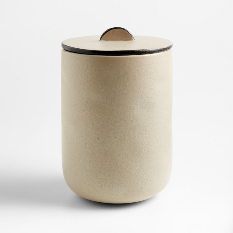 A vibrant kitchen, rooted in heritage. Our large Didi Mu canister was thoughtfully designed by Chef Eric Adjepong to be practical and lovely to use. The display-worthy ceramic food storage embraces beautiful imperfections with a textured cream-hued exterior and organic black edges on the tab handle and rim of the lid. A silicone gasket provides an airtight seal to keep contents fresh, while the glossy glazed interior ensures easy cleanup in the dishwasher. Our favorite detail? The raw terracotta base stamped with the Sankofa bird—a Ghanaian symbol that represents the wisdom of learning from the past to plan for the future.
