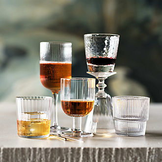 Looking for other bar glass styles? Explore specialty beer glasses designed to enhance the flavor of IPAs, pilsners, stouts and more. There are also red and white wine stemware as well as champagne glasses. In addition to glassware, be sure to consider the bar tools you need for a complete home bar. Shakers, muddlers and stoppers are all essential bar accessories. If you're looking to add some additional cheer to your holiday table, shop collections of chic seasonal barware glasses, including Christmas glassware, tumblers, highballs, lowballs, complete drink sets and a pair of wood counter stools for your guests. Our selection of glassware for every drink, home aesthetic and occasion is what makes Crate & Barrel the best place to buy glassware. What's more: bar glasses make for great graduation, birthday and Father's Day present ideas.