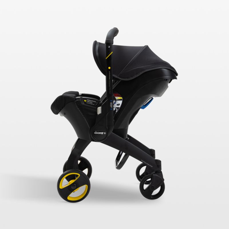 The sturdy yet lightweight Doona Compact Infant Car Seat and Stroller with Base is an all-in-one travel system that allows you to move from car seat to stroller in seconds. The innovative infant car seat transforms into a compact stroller, thanks to integrated wheels built into the base. The included Doona LATCH Base is compatible with the Doona Infant Car Seat and is intended for rear-facing use only. The base can be installed in your car for convenient snap-in, snap-out travel, or the seat can be used on its own with the vehicle's belt. The system's one-step fold/conversion from car seat to stroller makes errand running, sightseeing and far-flung adventures a breeze for parents. This sleek all-black Midnight Edition includes stylish touches like diamond shapes on the seat cover, black anodized aluminum and faux leather accents.