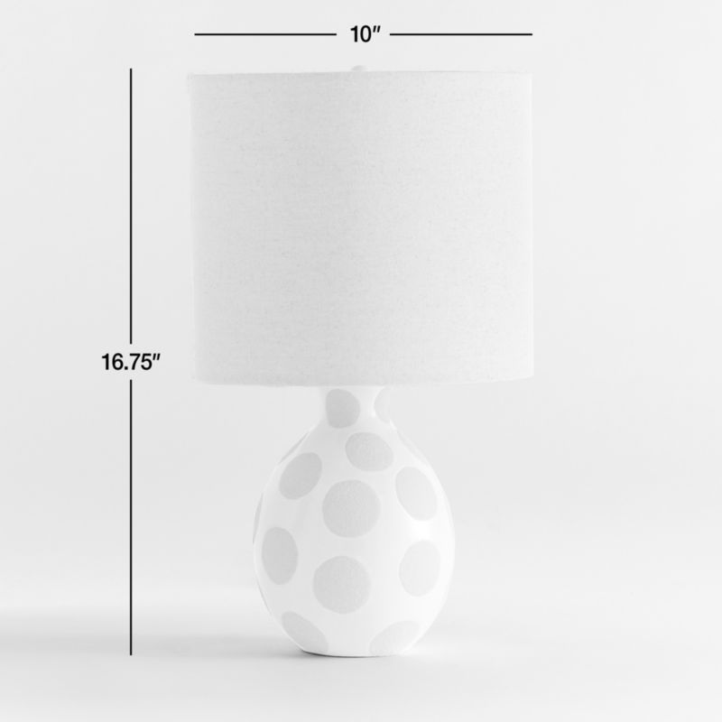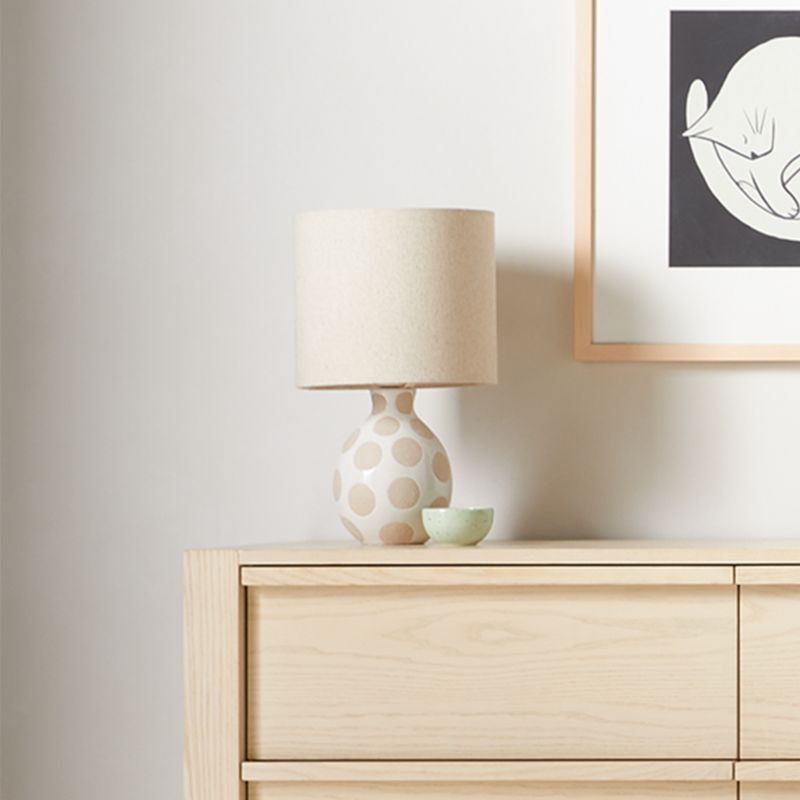 Our Dot White Ceramic Table Lamp shines a light on timeless mid-century style for the nursery, bedroom and beyond. To create the graphic dots, artisans use a three-step wax-resist technique: They apply a translucent glaze to the handcrafted textured ceramic base, then paint on the dots in wax, and finish with a glossy cream glaze. And just like that, the wax resists the second glaze to allow the textured ceramic dot pattern to show through. Topping it off is a flax-hued linen drum shade to provide a soft, warm glow.